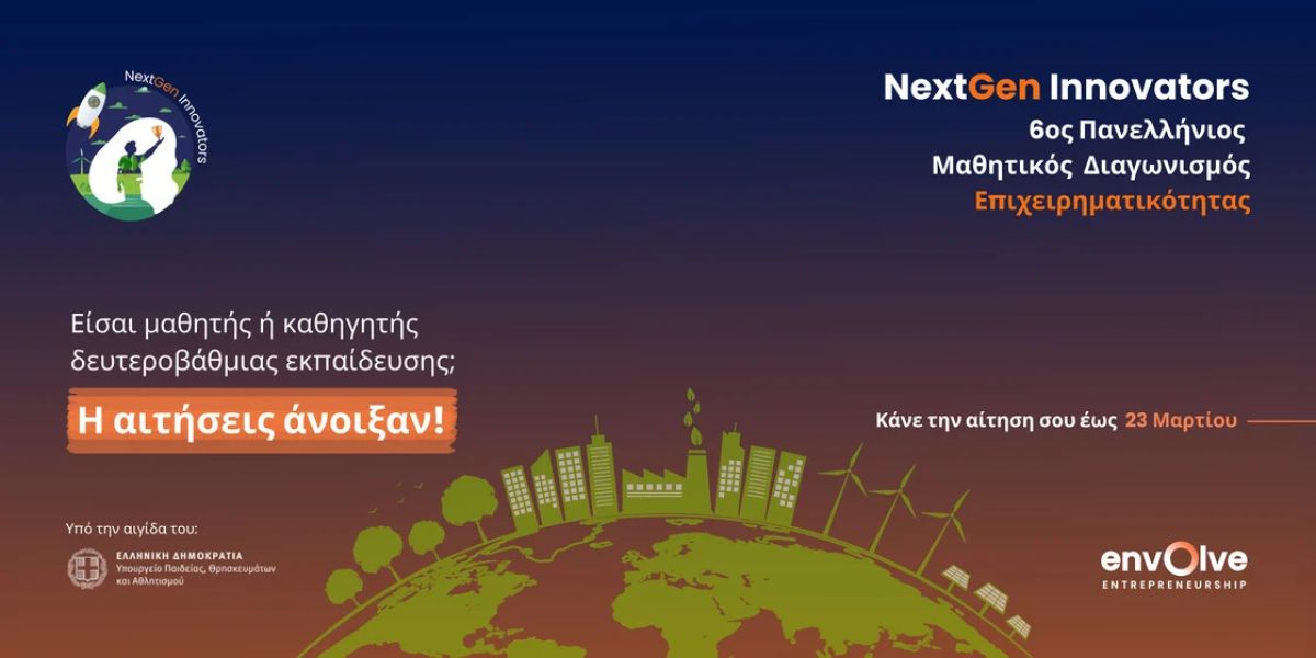 Το Envolve Entrepreneurship ανακοινώνει την έναρξη του 6ου Πανελλήνιου Μαθητικού Διαγωνισμού Επιχειρηματικότητας NextGen Innovators, προσκαλώντας μαθητές και μαθήτριες Γυμνασίων, Γενικών Λυκείων και ΕΠΑΛ από όλη την Ελλάδα, αλλά και την Ομογένεια, να αναπτύξουν και να παρουσιάσουν τις δικές τους καινοτόμες, βιώσιμες επιχειρηματικές ιδέες. Το NextGen Innovators αποτελεί ένα μοναδικό πρόγραμμα βιωματικής μάθησης, όπου μαθητικές ομάδες εργάζονται για να αναπτύξουν επιχειρηματικές ιδέες με ουσιαστικό περιβαλλοντικό και κοινωνικό αποτύπωμα. Οι αιτήσεις υποβάλλονται από εκπαιδευτικούς, ως υπεύθυνοι ομάδων, μέσω της επίσημης φόρμας. Η υποβολή των αιτήσεων θα πραγματοποιηθεί μέχρι τις 23 Μαρτίου 2026.
