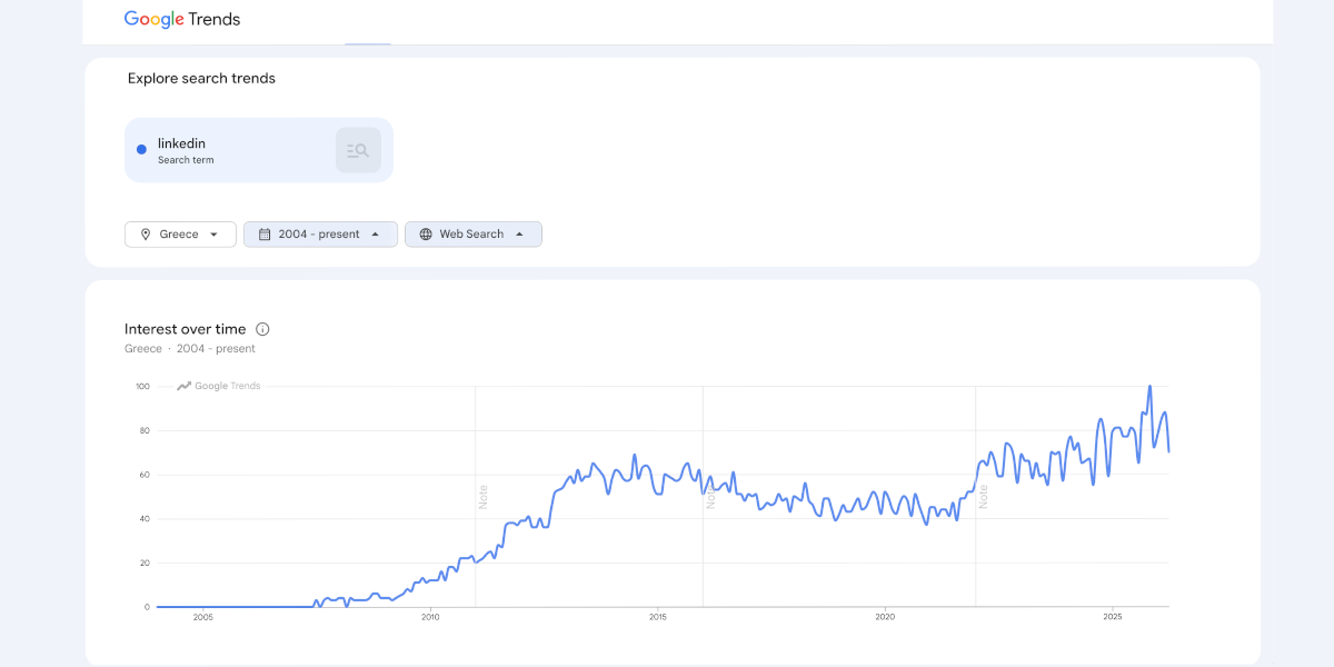 Όμως οι πιο δημοφιλείς αναζητήσεις – “linkedin jobs”, “linkedin login” – αποκαλύπτουν ότι η χρήση παραμένει βασική: αναζήτηση δουλειάς και πρόσβαση στο προφίλ. Λίγοι αξιοποιούν την πλατφόρμα για να χτίσουν άποψη, να αναπτύξουν σχέσεις ή να επηρεάσουν τον κλάδο τους.