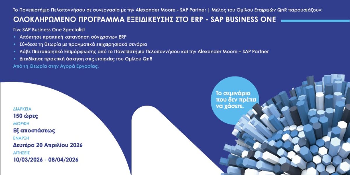 Ένα πρόγραμμα εξειδίκευσης που γεφυρώνει την ακαδημαϊκή γνώση με τις πραγματικές ανάγκες της αγοράς υλοποιούν από κοινού ο Όμιλος Quality & Reliability, το Τμήμα Διοικητικής Επιστήμης και Τεχνολογίας του Πανεπιστημίου Πελοποννήσου και η Alexander Moore – SAP Partner. Το πρόγραμμα «Εκπαίδευση στο SAP Business One: Ο Δρόμος προς την Εξειδίκευση στο ERP» απευθύνεται σε φοιτητές, αποφοίτους και επαγγελματίες που θέλουν να αποκτήσουν εξειδίκευση σε συστήματα ERP, έναν τομέα με αυξανόμενη ζήτηση στην αγορά εργασίας.