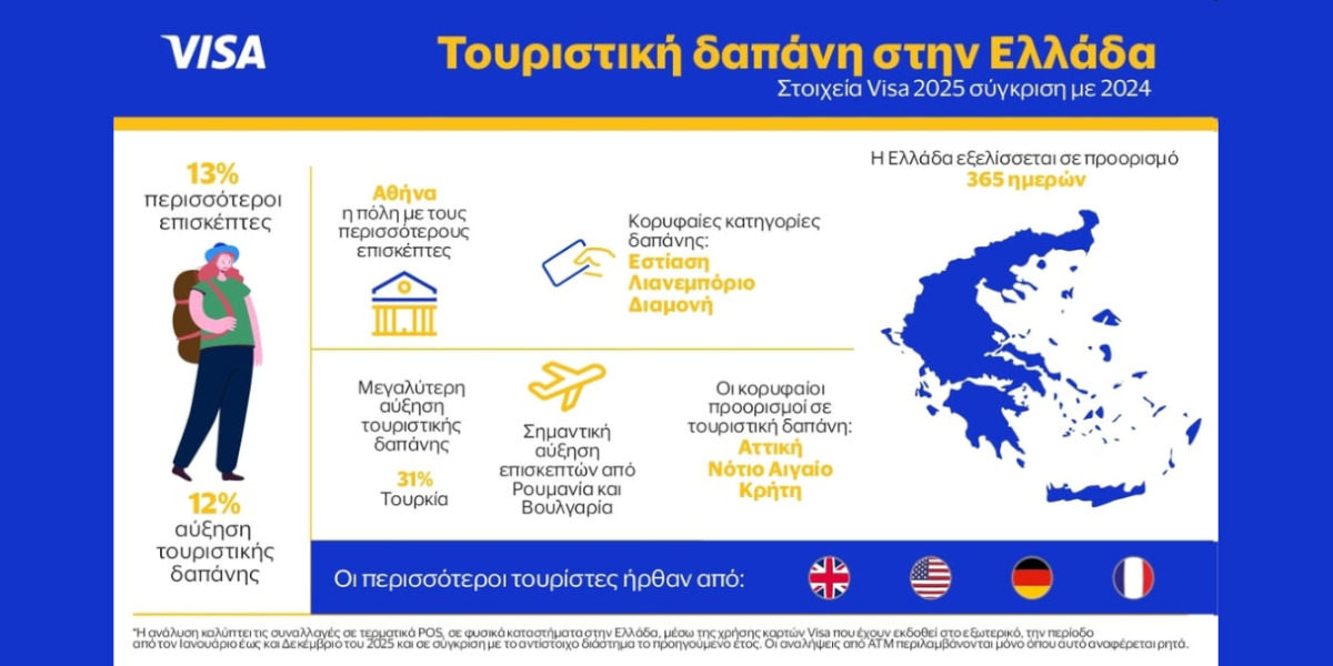 Οι ψηφιακές πληρωμές αποτυπώνουν όλο και πιο ανάγλυφα τον παλμό του ελληνικού τουρισμού. Τα στοιχεία που παρουσίασε η Visa στο πλαίσιο της ανανέωσης του μνημονίου συνεργασίας με το Υπουργείο Τουρισμού δίνουν μια σαφή εικόνα: Οι δαπάνες με κάρτες εκδοθείσες στο εξωτερικό αυξήθηκαν κατά 12% το 2025, ενώ ο αριθμός των ξένων επισκεπτών που τις χρησιμοποίησαν ενισχύθηκε κατά 13% σε σχέση με το 2024. Το Ηνωμένο Βασίλειο, οι ΗΠΑ, η Γερμανία και η Γαλλία παραμένουν οι κύριες αγορές προέλευσης, αλλά το πιο εντυπωσιακό νούμερο έρχεται από την Τουρκία: Αύξηση δαπανών 31% σε ένα μόνο χρόνο. Ρουμανία και Βουλγαρία κατέγραψαν επίσης αξιόλογη άνοδο, επιβεβαιώνοντας τη δυναμική των γειτονικών αγορών.