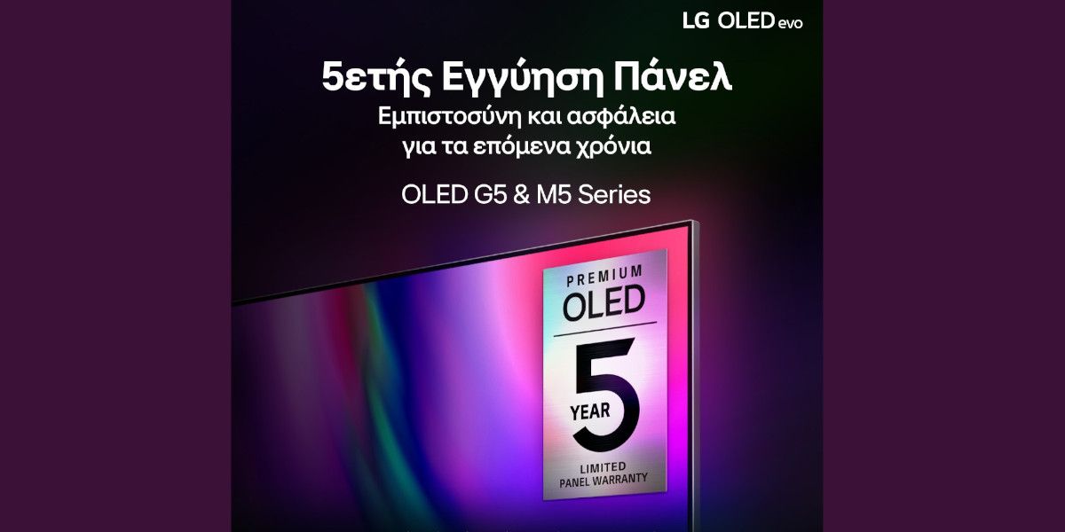 Η LG Electronics ανακοινώνει την παροχή 5ετούς εγγύησης πάνελ για τις τηλεοράσεις των σειρών OLED evo G5 και M5. Η εγγύηση ισχύει για όλα τα διαθέσιμα μεγέθη των συγκεκριμένων σειρών και ενισχύει ακόμα περισσότερο την εμπιστοσύνη των καταναλωτών στις πλέον προηγμένες OLED τηλεοράσεις της αγοράς. Είτε πρόκειται για νέες αγορές είτε για ήδη εγκατεστημένα μοντέλα που πληρούν τις προϋποθέσεις, η κάλυψη ισχύει με απλή απόδειξη αγοράς. Η εγγύηση ισχύει για οικιακή χρήση εντός της χώρας και αφορά αποκλειστικά τον αρχικό κάτοχο. Οι σειρές LG OLED evo G5 και M5 προσφέρουν ασυναγώνιστη εμπειρία θέασης, χάρη στην αιχμή της τεχνολογίας που ενσωματώνουν: