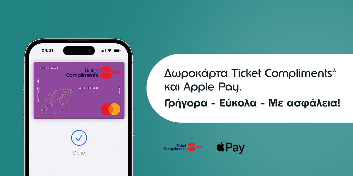 Η Edenred φέρνει στους χρήστες της λύσης Ticket Compliments® την ασφάλεια και την ευκολία του Apple Pay. Οι κάτοχοι της Ticket Compliments® μπορούν πλέον να αποφεύγουν την επαφή με κουμπιά ή τρίτους κατά την συναλλαγή.