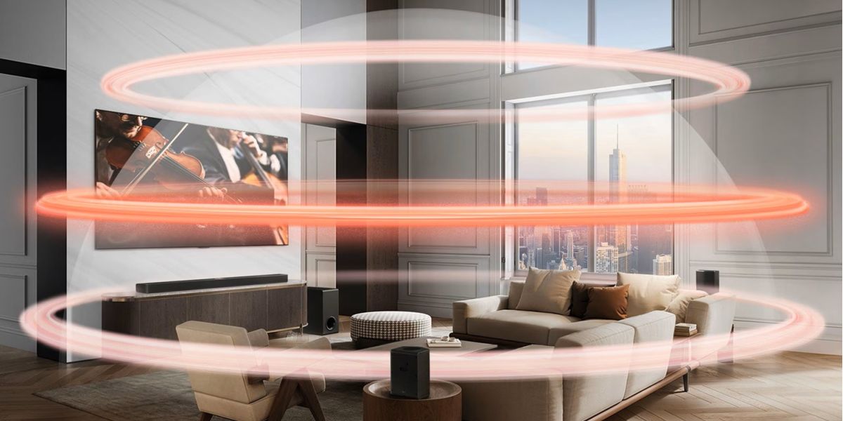 Ο πραγματικά καθηλωτικός ήχος οφείλεται στα τριπλά ηχεία up firing και στο κεντρικό κανάλι up firing, που προσφέρει πιο καθαρές φωνές και ιδανικό συγχρονισμό με την εικόνα, χωρίς καθυστερήσεις ή τρέμουλο. Ο χωρικός ήχος τριπλού επιπέδου προσθέτει ένα εικονικό επίπεδο και δημιουργεί έναν ηχητικό θόλο, ώστε ο ήχος να αγκαλιάζει ομοιόμορφα όλο το δωμάτιο, θυμίζοντας κινηματογραφική αίθουσα.