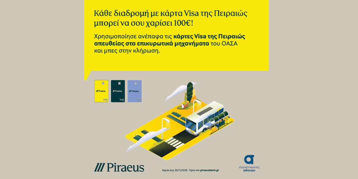 Συγκεκριμένα, έως και 30 Νοεμβρίου 2025, οι κάτοχοι καρτών Πειραιώς, χρησιμοποιώντας τις χρεωστικές, πιστωτικές και προπληρωμένες κάρτες τους Visa στα επικυρωτικά μηχανήματα των ΜΜΜ του ΟΑΣΑ (λεωφορεία, τρόλεϊ, μετρό και τραμ), μπαίνουν αυτόματα στην κλήρωση όπου 500 τυχεροί νικητές, θα κερδίσουν 100 ευρώ ο καθένας. Η διαδικασία είναι απλή, γρήγορη και ασφαλής.