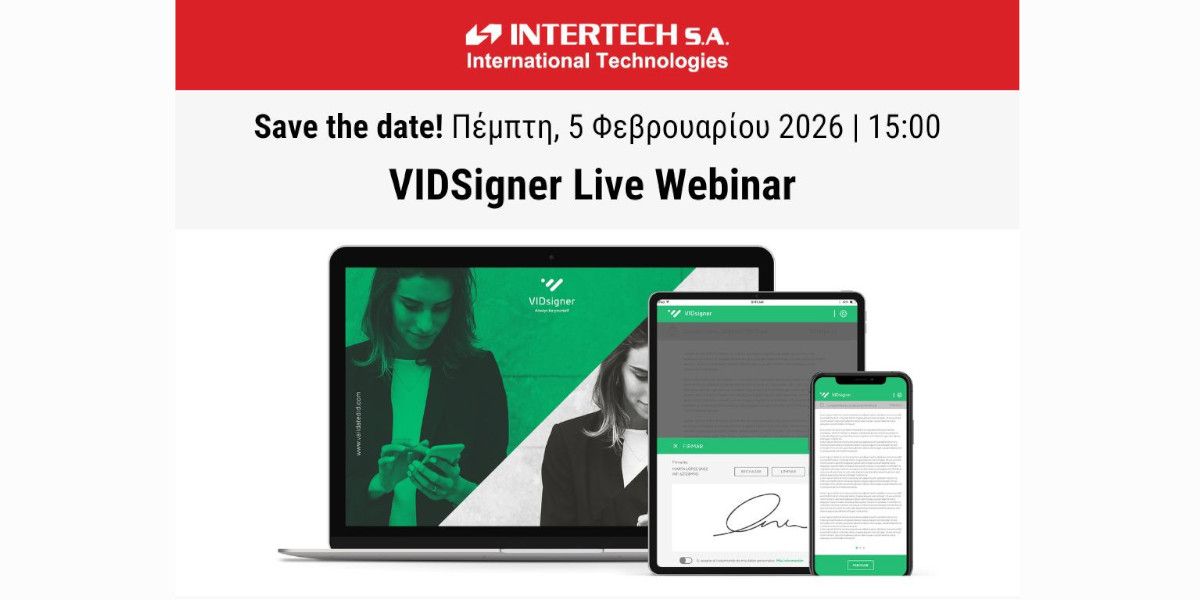 Η Intertech SA σας προσκαλεί να παρακολουθήσετε ένα δωρεάν webinar αφιερωμένο στην ηλεκτρονική υπογραφή, όπου θα παρουσιαστεί αναλυτικά το portfolio της ValidatedID (μέλος του Signaturit Group). Η εμπειρία που θα σας προσφέρει το webinar περιλαμβάνει: